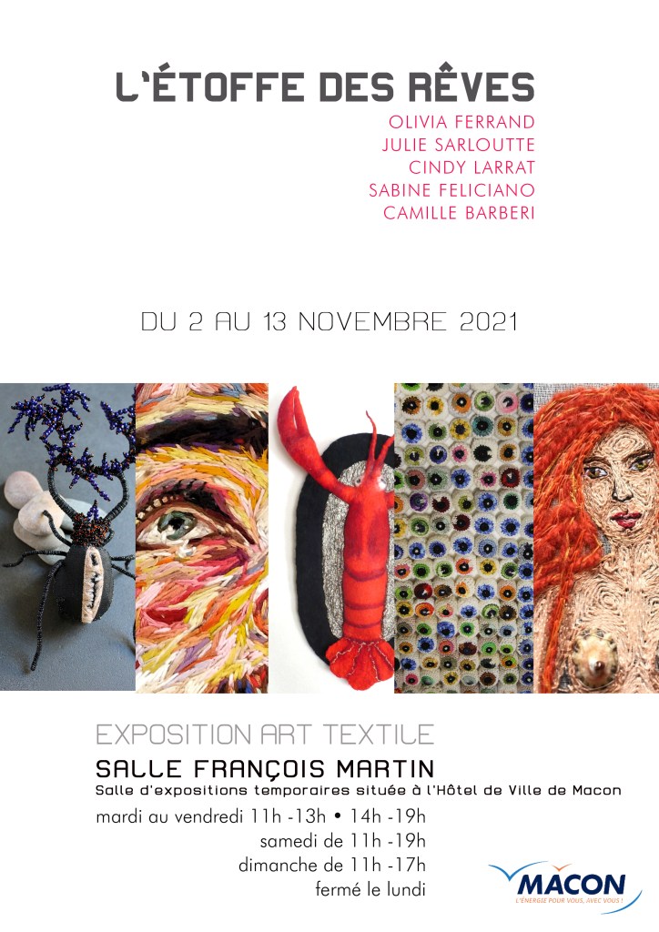Je suis ravie de vous annoncer ma prochaine exposition d’art textile intitulée « l’étoffe des rêves », en très belle compagnie!